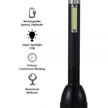 5W Rechargeable Flashlight with 2 Steps Switch 3W COB, 18650 Lithium Battery 2400 m Ah, V8 Port, Head Diameter: 6.2CM, Height: 27CM, Black