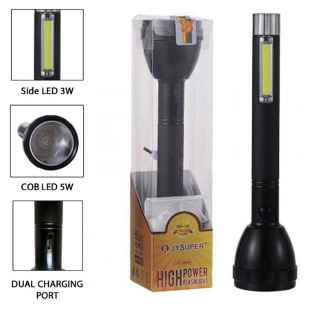 5W Rechargeable Flashlight with 2 Steps Switch 3W COB, 18650 Lithium Battery 2400 m Ah, V8 Port, Head Diameter: 6.2CM, Height: 27CM, Black